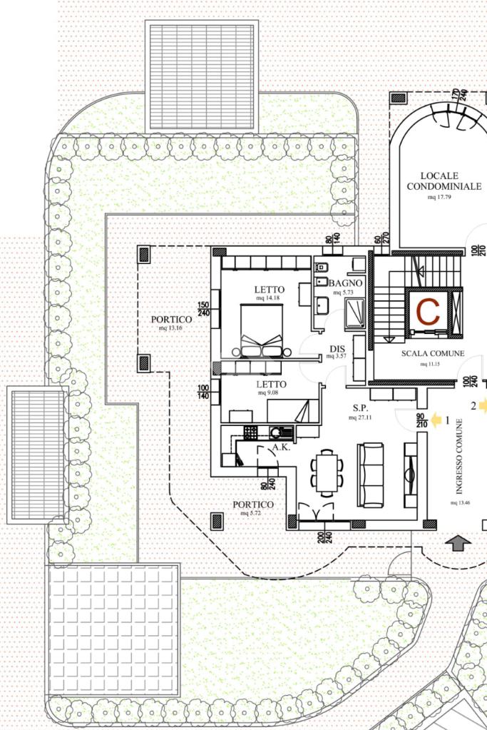 L’appartamento, posto al piano terra e sviluppato su un unico livello, è composto da: ingresso su soggiorno con angolo cottura, disimpegno, due camere, bagno, ampio giardino privato di 210 mq.