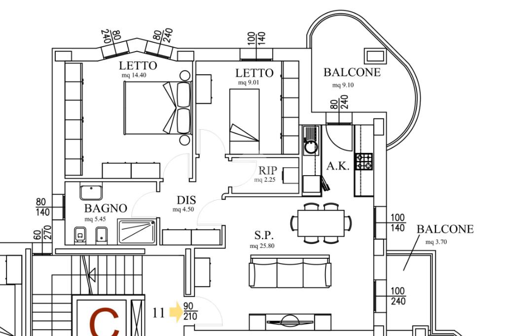 L’appartamento, posto al primo piano è sviluppato su un unico livello, ed è composto da: ingresso su soggiorno con angolo cottura, disimpegno, due camere, bagno, ripostoglio e due balconi.