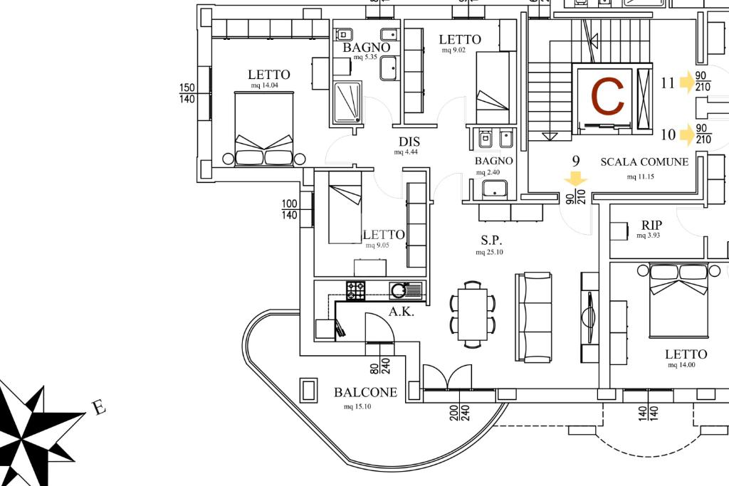 L’appartamento, posto al secondo piano è sviluppato su un unico livello, ed è composto da: ingresso su soggiorno con angolo cottura, disimpegno, tre camere, due bagni e terrazzo di 13mq