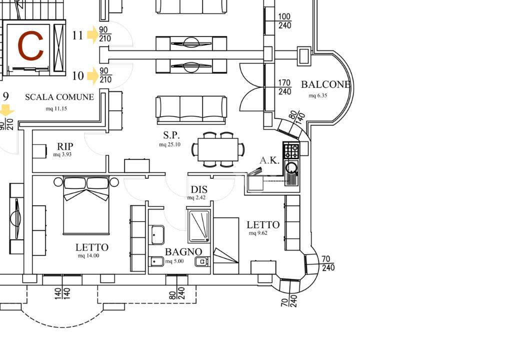 L’appartamento, posto al secondo piano è sviluppato su un unico livello, ed è composto da: ingresso su soggiorno con angolo cottura, disimpegno, due camere, bagno, ripostoglio e balcone.