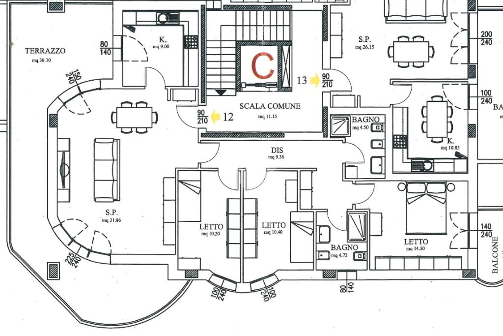 L’appartamento, posto all'ultimo piano è sviluppato su un unico livello, ed è composto da: ingresso su soggiorno con angolo cottura separato, terrazzo di 38mq, disimpegno, tre camere di cui una con balcone e due bagni.